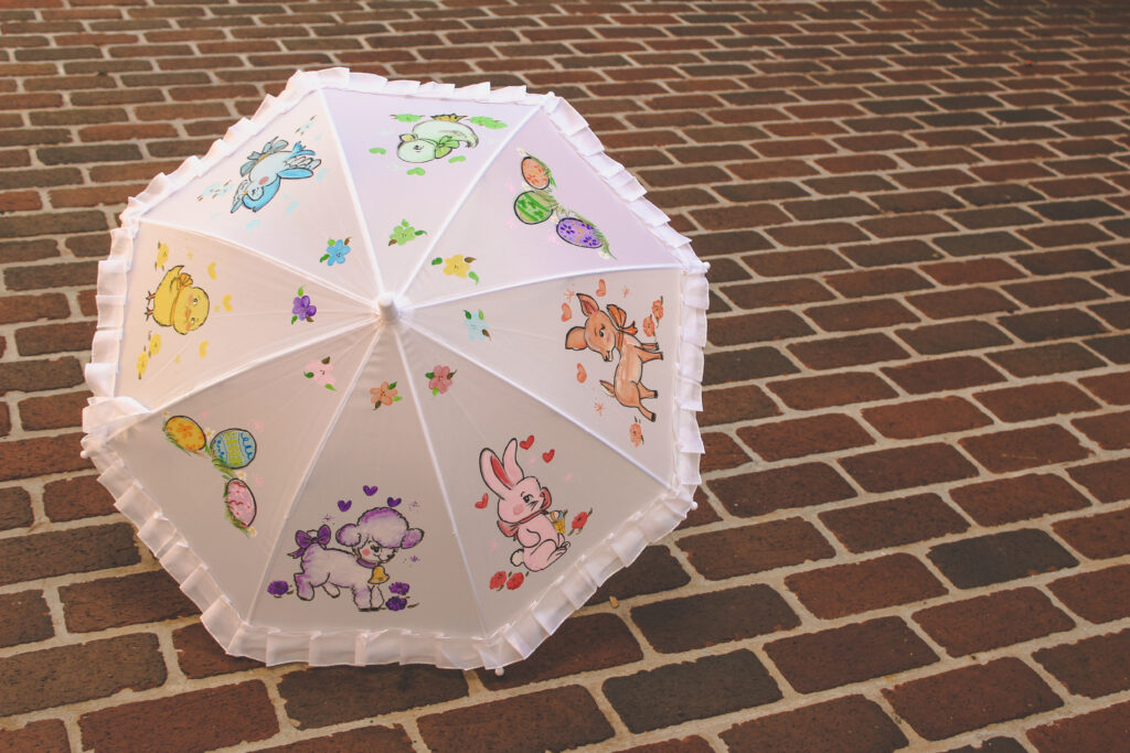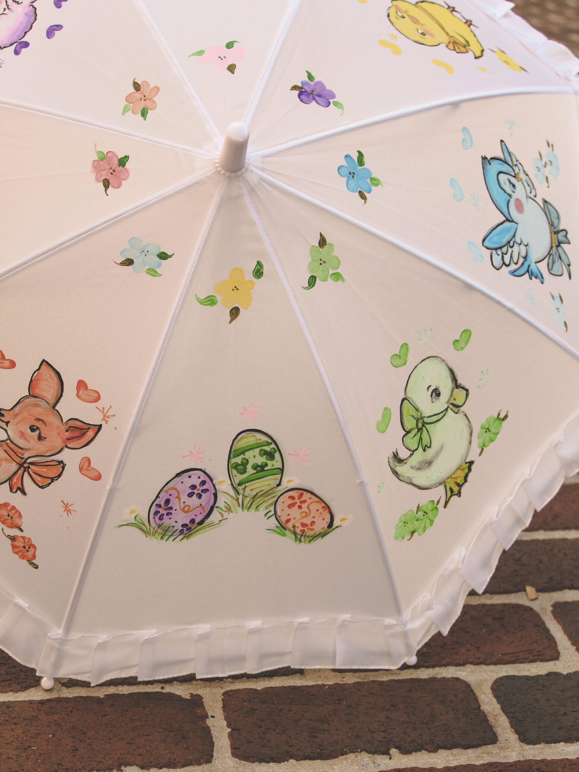 Now through Easter, our talented parasol artists are creating springtime masterpieces right before your eyes. Our most popular paint colors this time of year are shades of blush, lavender, butter yellow, and baby blue. That said, each pastel Easter design is still unique. Some feature intricate floral patterns, while others are adorned with baby animals, eggs, or dainty hidden detailing. The overall effect is whimsical, yet steeped in tradition.